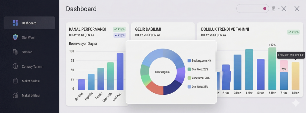 Her kanal yönetiminin ayrı çalışma sistemi olması ve internet ortamında en önemli kıstas olan üst sırada çıkmasını otel hizmetlerinizle birlikte sağlıyoruz. Rakip otellerin süreçlerini ve doluluk oranlarının takibini yaparak, bir adım önde olmanızı sağlıyoruz. Booking.com Expedia.com Agoda.com ve yerli kanallarda en doğru şekilde otelinizi profesyonel olarak ön plana çıkarıyoruz.