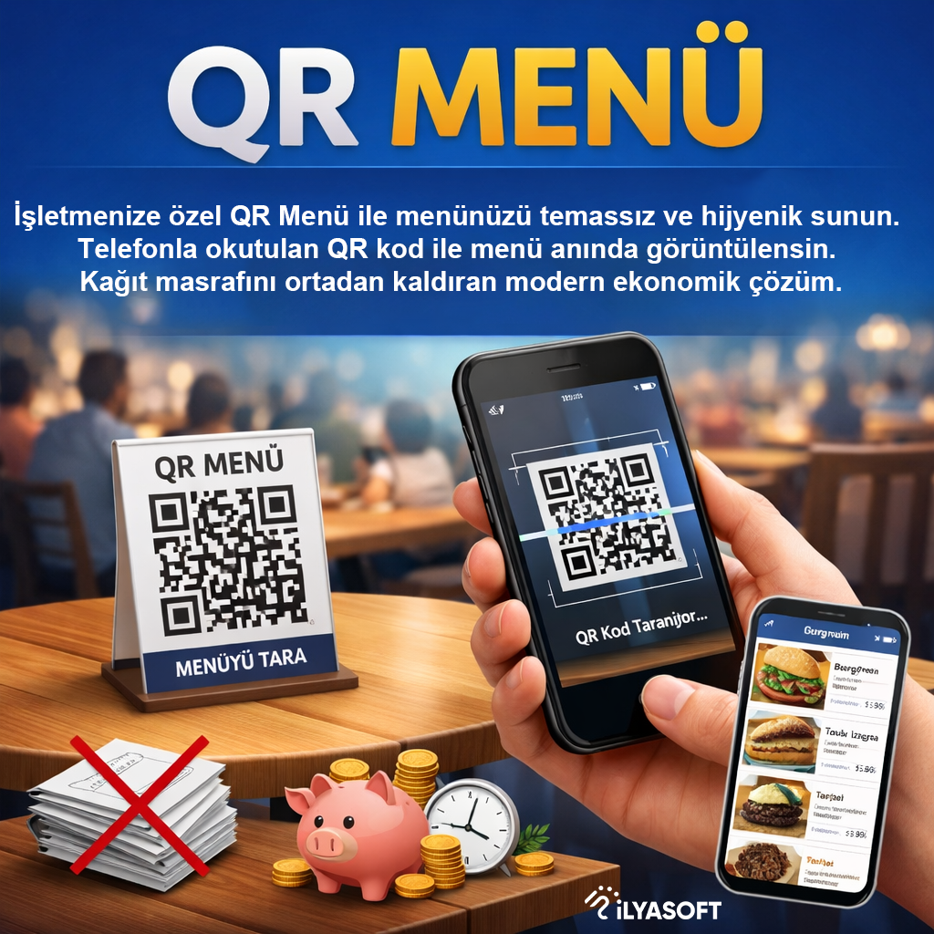 Qr menü, Covid-19 ile gelen hijyen standartları ile hayatımıza girmiştir. Bu menü ile müşterileriniz menüye temas etmeden masanızdaki qr kod ile telefonlarından sipariş verebilirler. Böylece garsonunuzun servisi daha hızlı alacaktır. Bununla birlikte daha verimli bir çalışma sistemi yürütmüş olursunuz. Hızlı ve hijyenik çalışma ortamının yanında çok fazla müşterinin geldiği saatlerde daha kolay sipariş alabilirsiniz. ILYASOFT Restaurant Paket Servis yazılımımız ile ihtiyaçlarınıza ve entegrasyona göre özel fiyatlar alabilir,siniz. Üstelik tüm bunları tek bir yazılımla alabilirsiniz.